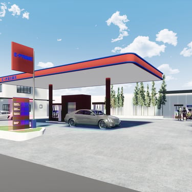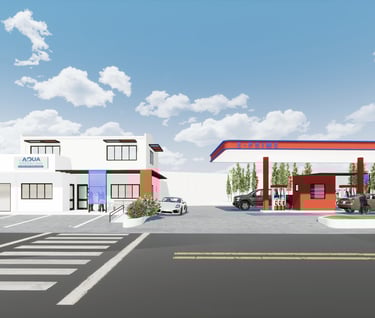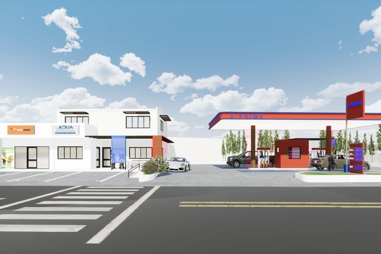 The completed design is a stunning 2-story commercial structure that features a gas station, a water refilling station, and a commercial building that can be used for a mini-mart or restaurant.